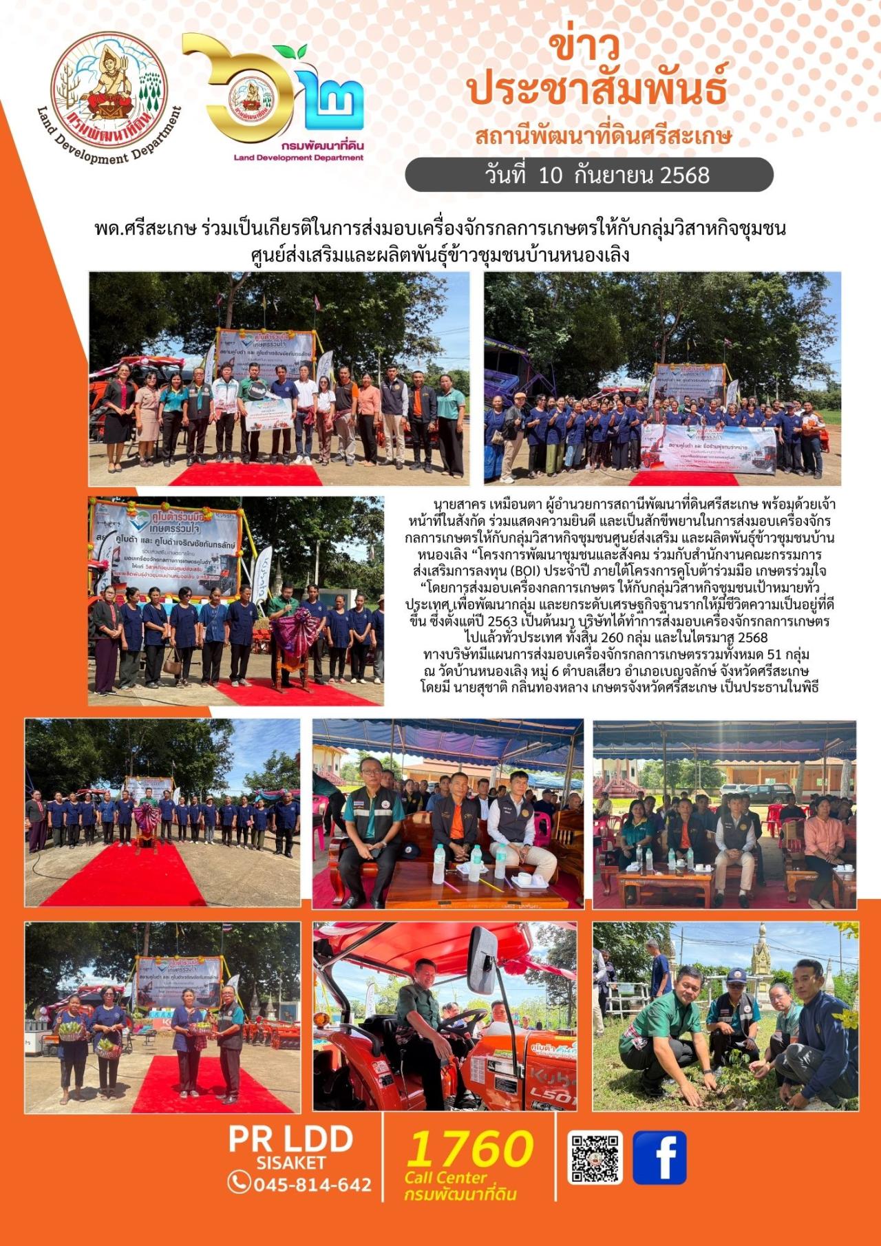 นายสาคร เหมือนตา ผู้อำนวยการสถานีพัฒนาที่ดินศรีสะเกษ พร้อมด้วยเจ้าหน้าที่ในสังกัด ร่วมแสดงความยินดี และเป็นสักขีพยานในการส่งมอบเครื่องจักรกลการเกษตรให้กับกลุ่มวิสาหกิจชุมชนศูนย์ส่งเสริม และผลิตพันธุ์ข้าวชุมชนบ้านหนองเลิง “โครงการพัฒนาชุมชนและสังคม ร่วมกับสำนักงานคณะกรรมการส่งเสริมการลงทุน (BOI) ประจำปี ภายใต้โครงการคูโบต้าร่วมมือ เกษตรร่วมใจ “ โดยการส่งมอบเครื่องกลการเกษตร ให้กับกลุ่มวิสาหกิจชุมชนเป้าหมายทั่วประเทศ เพื่อพัฒนากลุ่ม และยกระดับเศรษฐกิจฐานรากให้มีชีวิตความเป็นอยู่ที่ดีขึ้น ซึ่งตั้งแต่ปี 2563 เป็นต้นมา บริษัทได้ทำการส่งมอบเครื่องจักรกลการเกษตรไปแล้วทั่วประเทศ ทั้งสิ้น 260 กลุ่ม และในไตรมาส 2568 ทางบริษัทมีแผนการส่งมอบเครื่องจักรกลการเกษตรรวมทั้งหมด 51 กลุ่ม