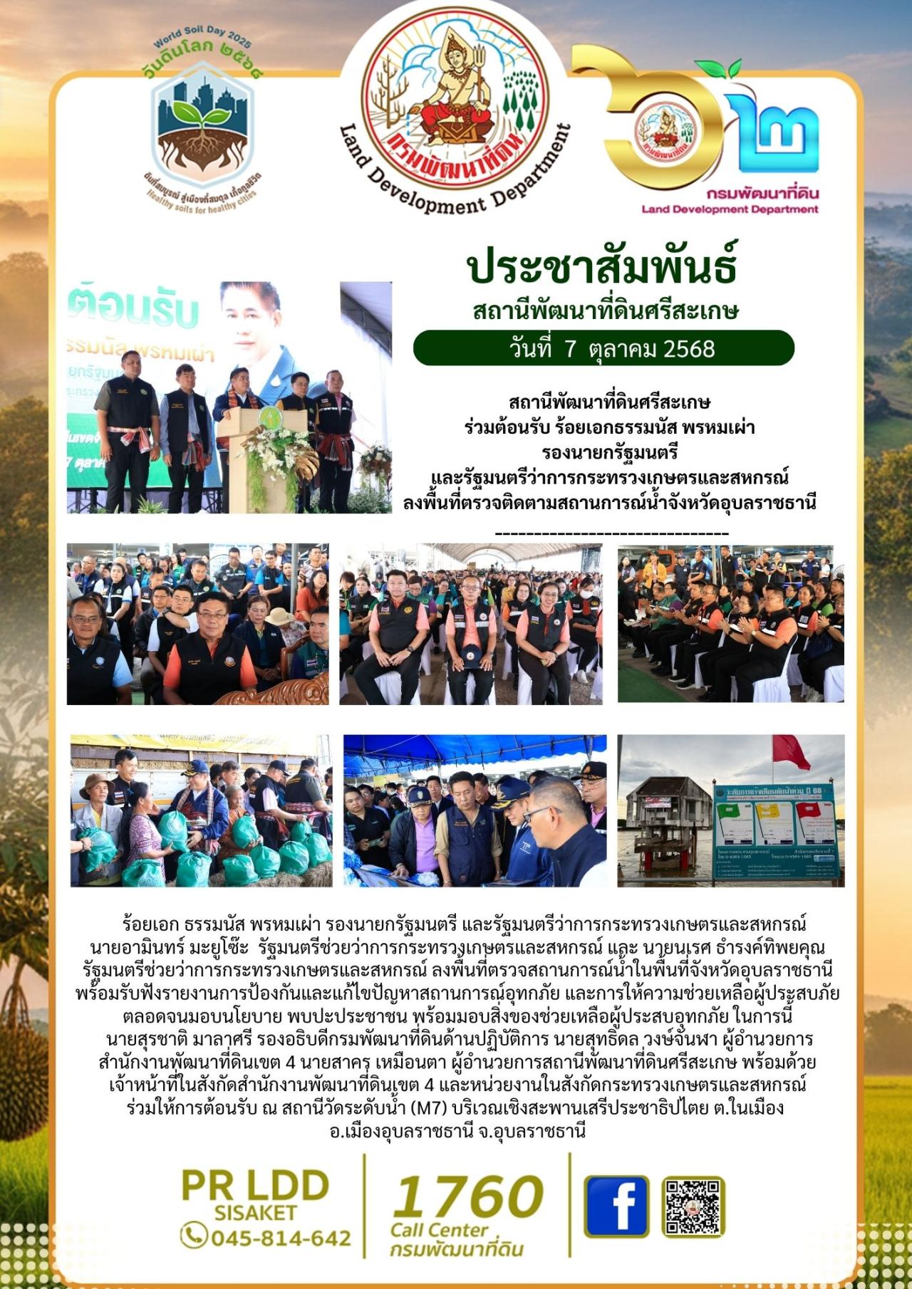 ในการนี้ นายสุรชาติ มาลาศรี รองอธิบดีกรมพัฒนาที่ดินด้านปฏิบัติการ นายสุทธิดล วงษ์จันฬา ผู้อำนวยการสำนักงานพัฒนาที่ดินเขต 4 นายสาคร เหมือนตา ผู้อำนวยการสถานีพัฒนาที่ดินศรีสะเกษ พร้อมด้วยเจ้าหน้าที่ในสังกัดสำนักงานพัฒนาที่ดินเขต 4 และหน่วยงานในสังกัดกระทรวงเกษตรและสหกรณ์ร่วมให้การต้อนรับ ณ สถานีวัดระดับน้ำ (M7) บริเวณเชิงสะพานเสรีประชาธิปไตย ต.ในเมือง อ.เมืองอุบลราชธานี จ.อุบลราชธานี