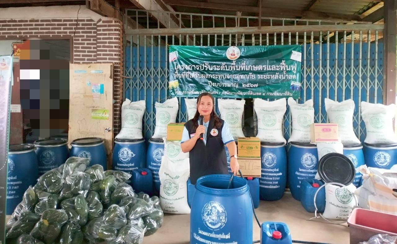 นางสาวสุวรรณภา บุญจงรักษ์ ผู้อำนวยการสถานีพัฒนาที่ดินยโสธร มอบหมาย นางจุฑาทิพย์ สีดาพาลี เจ้าพนักงานการเกษตรปฏิบัติงาน พร้อมเจ้าหน้าที่ ดำเนินการมอบปัจจัยโครงการฟื้นฟูพื้นที่ที่ได้รับผลกระทบจากอุทกภัย ระยะหลังน้ำลด ปี 2567 (ผลกระทบจากอุทกภัย ร่องมรสุม ต่อเนื่องมาถึงพายุโซนร้อน" ซูลิก"ปี2567 ) แก่เกษตรกร บ้านป่าตอง ม.3 ต.โพธิ์ไทร อ.ป่าติ้ว จ.ยโสธร โดยส่งเสริมให้ความรู้แก่เกษตรกร ในเรื่องการปรับปรุงบำรุงดิน โดยใช้นวัตกรรมเทคโนโลยีชีวภาพทางดินของกรมพัฒนาที่ดิน พร้อมมอบปัจจัยในการปรับปรุงบำรุงดิน ได้แก่ ปุ๋ยหมัก , เมล็ดพันธุ์พืชปุ๋ยสด (ปอเทือง) , ถังหมัก , กากน้ำตาล ,วัสดุหมัก เพื่อทำน้ำหมักชีวภาพ และพด.1,2,3,7 เพื่อเป็นการฟื้นฟูปรับปรุงบำรุงดินที่ได้รับผลกระทบจากปัญหาดังกล่าวและเพื่อลดต้นทุนการผลิตของเกษตรกร