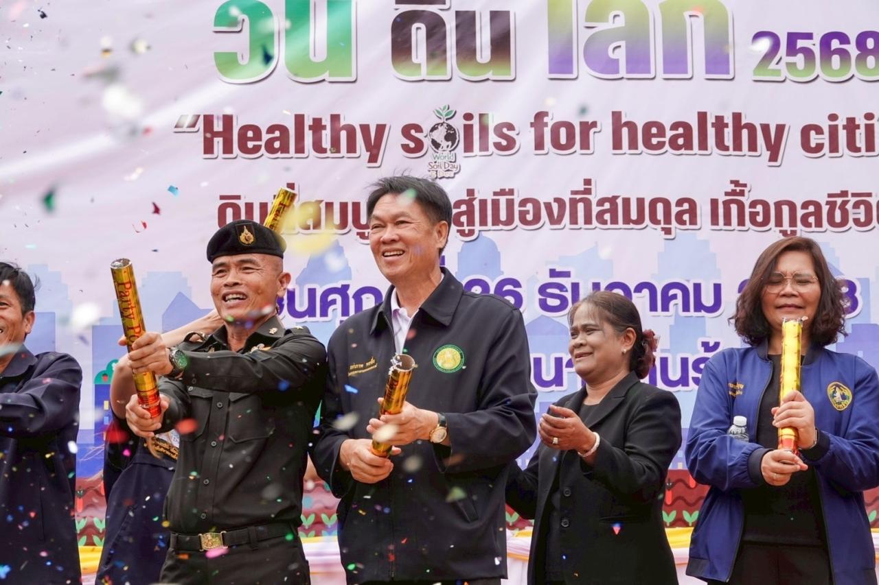 สถานีพัฒนาที่ดินร้อยเอ็ด จัดงานวันดินโลก ประจำปี 2568 ภายใต้หัวข้อ “Healthy soils for healthy cities “ดินที่สมบูรณ์ สู่เมืองที่สมดุล เกื้อกูลชีวิต” โดยมี ดร.เอกภาพ พลซื่อ โฆษกกระทรวงเกษตรและสหกรณ์ นางสาวสิญารัตน์ ณรงค์ภักดีรัตน์ ผู้อำนวยการสถานีพัฒนาที่ดินร้อยเอ็ด กล่าวรายงานวัตถุประสงค์ของการจัดงานครั้งนี้ หัวหน้าส่วนราชการจังหวัดร้อยเอ็ด ผู้แทน หมอดินอาสา เกษตรกร นักเรียนและสื่อมวลชน เข้าร่วมจำนวน 300 ราย เพื่อน้อมรำลึกพระมหากรุณาธิคุณพระบาทสมเด็จพระบรมชนกาธิเบศร มหาภูมิพลอดุลยเดชมหาราช บรมนาถบพิตร ที่ทรงเป็นนักวิทยาศาสตร์ด้านดินเพื่อมนุษยธรรม เผยแพร่พระราชกรณียกิจด้านการพัฒนาทรัพยากรดินและสืบสานพระราชปณิธาน ตระหนักถึงความสำคัญของการอนุรักษ์และพัฒนาทรัพยากรดินและน้ำ ณ สถานีพัฒนาที่ดินร้อยเอ็ด ตำบลสระคู อำเภอสุวรรณภูมิ จังหวัดร้อยเอ็ด