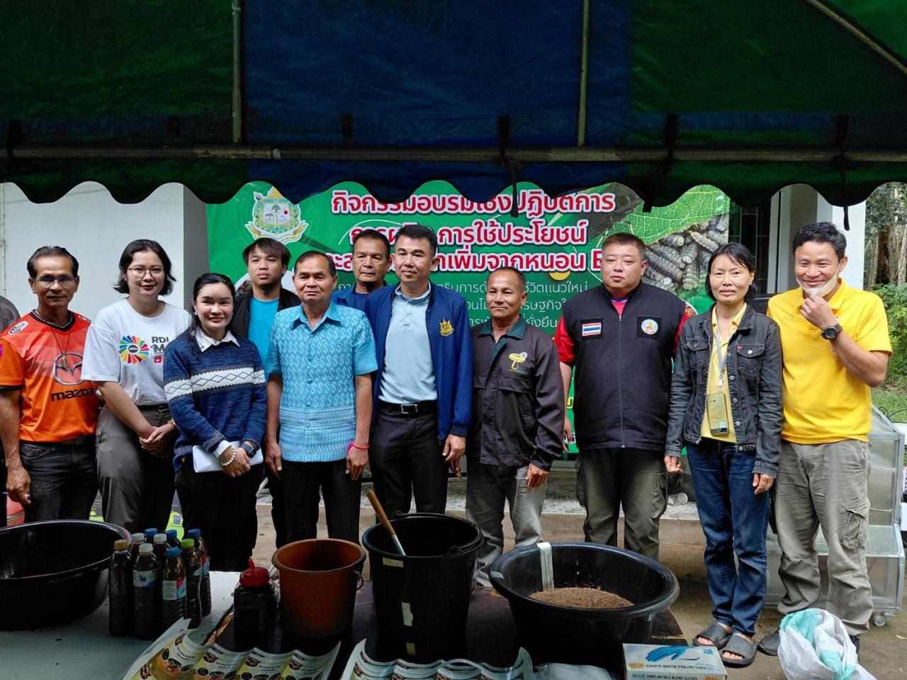 วันศุกร์ที่ 27 มิถุนายน 2568 นายศราวุธ ศิริลักณ์ ผู้อำนวยการสถานีพัฒนาที่ดินนครพนม มอบหมายให้ นายวรศักดิ์ พัฒนภูทอง นักวิชาการเกษตร ร่วมเป็นวิทยากรกิจกรรมอบรมเชิงปฏิบัติการ การผลิต การใช้ประโยชน์ และสร้างมูลค่าเพิ่มจากหนอน BSF ประจำปีงบประมาณ 2568 เพื่อส่งเสริมแนวคิด BCG มีการใช้ทรัพยากรน้อยลง เกิดของเสียน้อยที่สุด เป็นมิตรกับสิ่งแวดล้อม และสามารถต่อยอดสู่การสร้างโอกาส สร้างรายได้ ในหัวข้อ"การทำดินปลูกและวัสดุปรับปรุงดินจากมูลหนอน BSF ณ กลุ่มธนาคารต้นไม้ตำบลเวินพระบาท หมู่ 4 ตำบลเวินพระบาท อำเภอท่าอุเทน จังหวัดนครพนม